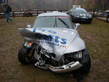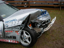 Josh picked me up at the Cleveland airport on Friday evening about 8:30, two hours later than I should have arrived. We had dinner and headed down the interstate towards the track at Mid Ohio. We observed the immediate aftereffects of a single car accident in front of us. Car hit the right guard rail and then ran across the highway down into the median. We stopped, backed up, and Josh ran out to see if all was OK. Lots of debris on the highway. I called 911 to report, got the local sheriff, who transferred me to the highway patrol. They said that the accident had been observed by a patrolman going the other way, and that he was just turning around. I went down to the car. When the cop arrived, I told him there was bodily injury, so he called for an ambulance. He was a jerk. He went down to the car, and instead of asking the woman if she was OK, he just asked her to produce identification and insurance papers. When he asked if there was someone who should be called, she gave a number, but he said he couldn't remember it, and had no paper or pencil. We decided to leave, and he asked us to help clean the debris off the roadway- something very dangerous, since it was an interstate, with traffic flowing. We kicked a few things off as we crossed the highway to the BMW, and took off. Got to the track and the motor home, and called it a night. Rained all night. Noisy, but I was tired, so slept pretty well. The next day it was very damp, but not really raining. We went to find the friends that Josh had been hanging around with. The first race of the day included two of his friends, and the fourth race, just after lunch, included 3 more. We hung out in the paddock area, and then went to watch the first race. Since the track was wet, there were several spins, and one of his friends failed to come out of turn 6 safely, and hit the wall at turn 7, smashing the front of his M3. But Dave was OK. After the race, we went back to the paddock area, giving help and support where we could. At lunch break, it really started pouring. The race started - we were watching above turn 7. Josh was carrying a walkie-talkie, in touch with his friend Ren, who was crew for his wife, Shauna. She was driving a BMW Z3 against a field of lots of Miatas. We watched the first few laps. At lap 5 we heard the announcer say something about an accident and one of the cars involved was Shauna's. The race shut down (red flag). Then we heard the announcer say that she was walking out of the car to the ambulance. So we ran to the medical facility. Shauna, it turns out, was OK, but was being taken to the hospital for full checkout.(Josh has since talked to Ren). Don't know about the other driver. I understand that the car in front of Shauna was suddenly facing her, and she didn't have time to do anything. Probably going 70 at the time, based on where the accident took place. Poor visibility, lousy traction. Both cars totaled. Race went only to 7 laps because it ran out of time. We went back to the motor home and packed up. Started to back up the RV, but since it had been raining for days now, it was stuck in very slick mud. It was hard to believe the a 23,000 pound vehicle couldn't get traction, but it couldn't. Really wanted out of there that day, so had to figure it out ourselves. All the tow trucks were busy on the track, and with the accident having just happened, all Josh's friends were otherwise occupied. We found some straw bales, and started stuffing straw under the rear tires. As Josh rocked the RV, I kept adding straw, and it finally worked. But with all the mud, we wanted to be careful, so we had to move the trailer by hand to the RV, as opposed to moving the RV to the trailer. That is one heavy trailer. We could only move it 6 inches at a time, but finally got it in a position to hook it up. Loaded the car, and we were off. Spent the night outside Erie, PA. Uneventful. Got up this morning with the idea of visiting the glass museum at Corning. Got there about noon. Decided to get some lunch first, so went downtown. Parking a 36 foot RV with a 21 foot trailer is not easy. But we found an empty Corning Glass parking lot, and decided to put it there, and walk to lunch. The entry way had a "gateway" made up of stone block piled on each other. It was a tough entry. The fender of the trailer kissed one of the stones and the whole thing came tumbling down. Josh felt terrible. We went to have lunch. Came back, and the exit was similar. But we thought we got out OK. As we were driving down the street, I could see this guy waving at us. I opened the window, and he told me that we had destroyed the gate on the way out, and that we should report it to Corning, as it was their parking lot, and that he was going to as well. Since it was Sunday, we figured we'd call on Monday, when they were open. Went to the glass museum, spent a couple of hours, and as we are pulling out, a security guard tells us to pull over. He has pictures of the damaged gateways, and tells us that the police are on the way. Very quickly, the Corning Police show up. If it were up to the guard, we would have spent the night in jail. The police were more reasonable, recording Josh's registrations and license and letting the security guard know that he could pick up the accident report at the station, and could contact Josh with an estimate of damages. We'll see what happens with that - that is, how big the bill to restack the stones will be. The fender on the trailer is damaged a bit, and the running light is gone. While one of the cops was doing all the paperwork, we chatted with the other one. Watch out in Corning! The police cars all have video cameras to record vehicle stops, and the driver has a mike to record all conversations. Josh asked the cop about his vest. It is a bulletproof vest, and both were wearing them. Individual choice, not department policy. Why, Josh asked. Looks like a sleepy little peaceful town. The cop told us that because it is near Elmira a