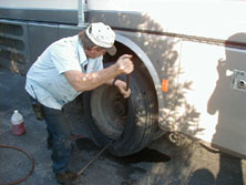 What is it they say about the best laid plans? The trouble began when I stopped at lunchtime to eat more leftovers, and started making calls for Daytona campgrounds. Now, each campground's entry in the guides has special statements about race week and bike week, but I was pretty sure that bike week (when the AMA guys race here) was in March. And I know that the Nascar boys are up in Rockingham, NC this weekend. (How do I know that? I just drove through Nascar country!) None of the campgrounds anywhere near Daytona had any space for me. The fifth (and last one) that I called did suggest another campground that I didn't have a listing for, called Racetrack RV, and gave me the number. Sure, they're not full, plenty of space. No need for a reservation! Huh, how weird that the others are all totally booked, but this one has enough space that I don't even need a reservation? Well, whatever, I said I'd stop by. It looked like I'd be there at about 3pm. Okay, so it's 3:30, and I'm behind schedule, but I'm only maybe 10 miles north of the exit when I started to hear all sorts of rattles in the motorhome. Now, occasionally something gets into a frequency where things start rattling, but this was a lot more than normal. But the road didn't look so hot. But it's not getting any better, and it's occasionally a lot worse. Then, all of a sudden, it's really loud. Okay, pull over. Sure enough, the right rear outer tire is totally history. Shredded. At least that's the worst of the 6, the one with the visible flat spot. The shoulder on I-95 here is really narrow though. I've got the right-side trailer tires in the very soft-looking muddy grass, and the right-side motorhome tires are just on the hairy edge of the pavement. Actually, the dead one is hanging over the grass, and the other two are on the hairy edge, which appears to be buckling under the weight. In addition, there is a lot of traffic and so the trucks on the road can't move over, so they are passing by very close, causing the motorhome to rock a tremendous amount in the wind, causing the pavement to buckle further ... let's just say that it wasn't a comfortable situation. I got back in and moved forward enough to get the right-side tires on more stable pavement, and I put down the levelling jacks to try to maintain some stability. Okay, I'm still really, really close to the passing trucks, but I no longer fear the motorhome tipping over in the wind they create. Now ... what do I do? Well, the next exit (the first Daytona exit) was right in front of me. I checked the software I've got, and this exit has everything, including service stations. So, I decide to crawl up there. After all, I've still got another right rear tire, and while it's seriously overloaded with weight, it's at least keeping the dead tire's rim off the ground. So, I crawled along on the narrow shoulder (with the trailer tires literally on the yellow line marking the travel lane) at 5mph and got to the exit, and pulled into a service station. I'm now very much wishing that I'd gotten one of those motorhome emergency repair deals like AAA has for cars (I'm a AAA member, but they don't do motorhomes). I walked up and talked to the mechanic on duty. Naturally, since I didn't have a spare, he couldn't help me. But the man inside did have a card for someone to call, so I did. They promised to send someone in 30-45 minutes, with a used tire for me. I figured used would be good. The other 5 are used anyway, and this way, I could get home to CA and then replace all 6. 40 minutes later, he calls me back. Not only can't they find a used one in my size, but they don't believe the size is right. I verify. It's right, 235/80R22.5. Okay, he'll check himself, then look for a new one. He calls me back 5 minutes later (it's now 4:45) to tell me that he'd found one tire shop who has a new one in stock, it's $330. The ones I have are discontinued, this is the new replacement for it. What's a guy to do? I told him to bring it. He said his man was on his way to pick up the tire and then come over. Meanwhile, I waste some time talking to the mechanic, as he washes his motorcycle. He asks if I'm in town for Bike Week. Bike Week is now? Well, no, that's in March. Now it's "Biketoberfest", which is just like Bike Week but without the racing. Ahh, that explains all of the bikes out there on the road and on trailers ... and that also explains why I couldn't find a campground. The tire guy showed up at 5:30. The levelling jacks don't get the rear wheels totally off the ground, so he got out his air jack and jacked up the axle. Then he popped off the cool stainless steel wheel covers to expose the incredibly ugly big gray wheels. But then instead of pulling the lug nuts like I expected him to do, he got out two big tire irons and muscled the old tire off the rim, with the rim still on the motorhome. And, it was easy! Then he got the new tire out of his truck, rolled it up to the now bare outer wheel, and with a few swift kicks, got the inner bead onto the wheel. The outer bead took a bit more effort, using the tire irons, but it went right on. Pumped up the tire, lowered it all down, and we were done. $40 for the road service, $22 for the mount, $7.50 for disposing of the old tire, and $334 for the new tire, and off I went. It was only a 2-and-a-half hour ordeal. Yes, I finally took pictures of one of my "situations" ... too bad you all can't see them yet! "Off I went" is a little simplistic. The motorhome wouldn't start. Fortunately, the main battery cable on the starter wasn't totally tight, and that fixed it right up. Okay, off to find this mysterious campground. It's actually nestled in a very quiet part of town, right between the race track and the airport :-) With Biketoberfest going on, it's really quiet and peaceful around here :-) Anyway, this campground is only open during the big Daytona events. They charge basically double what normal campgrounds charge, but beggars can't be choosers. At leas